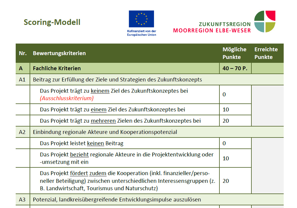 Das Scoring-Modell der Moorregion Elbe-Weser ist das Kernstück der Projektbewertung. Hier werden alle fachlichen Bewertungskriterien beschrieben und deren Gewichtung anhand der erreichbaren Punktzahl transparent dargestellt. Alle potenziellen Projekttragende sollten sich an diesem Scoring-Modell orientieren, um eine möglichst hohe Bewertung zu erhalten.